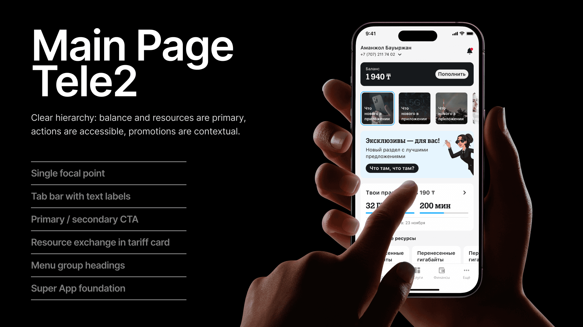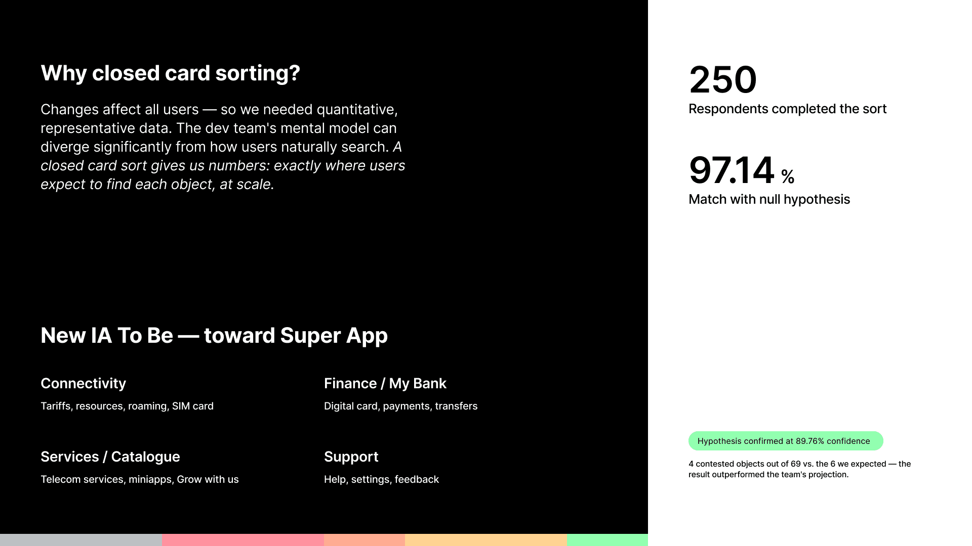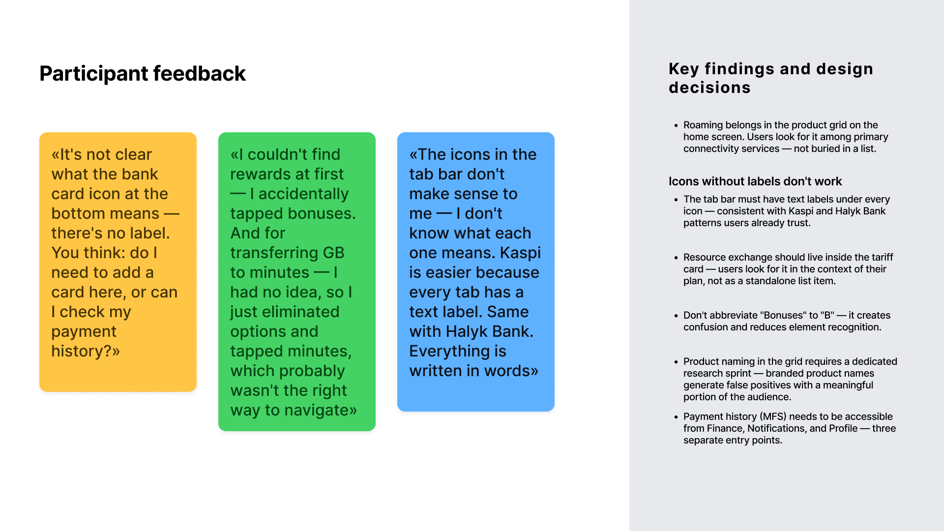 Step 1 — Closed card sort Tele2 KZ had outgrown its "telecom-only" app: Digital Card, a "For Me" section, and many non-telecom services had been added. All of this lived in an architecture designed for a simpler product. We needed to restructure — to make the user journey intuitive and give the business room to surface the right offers in the right places.