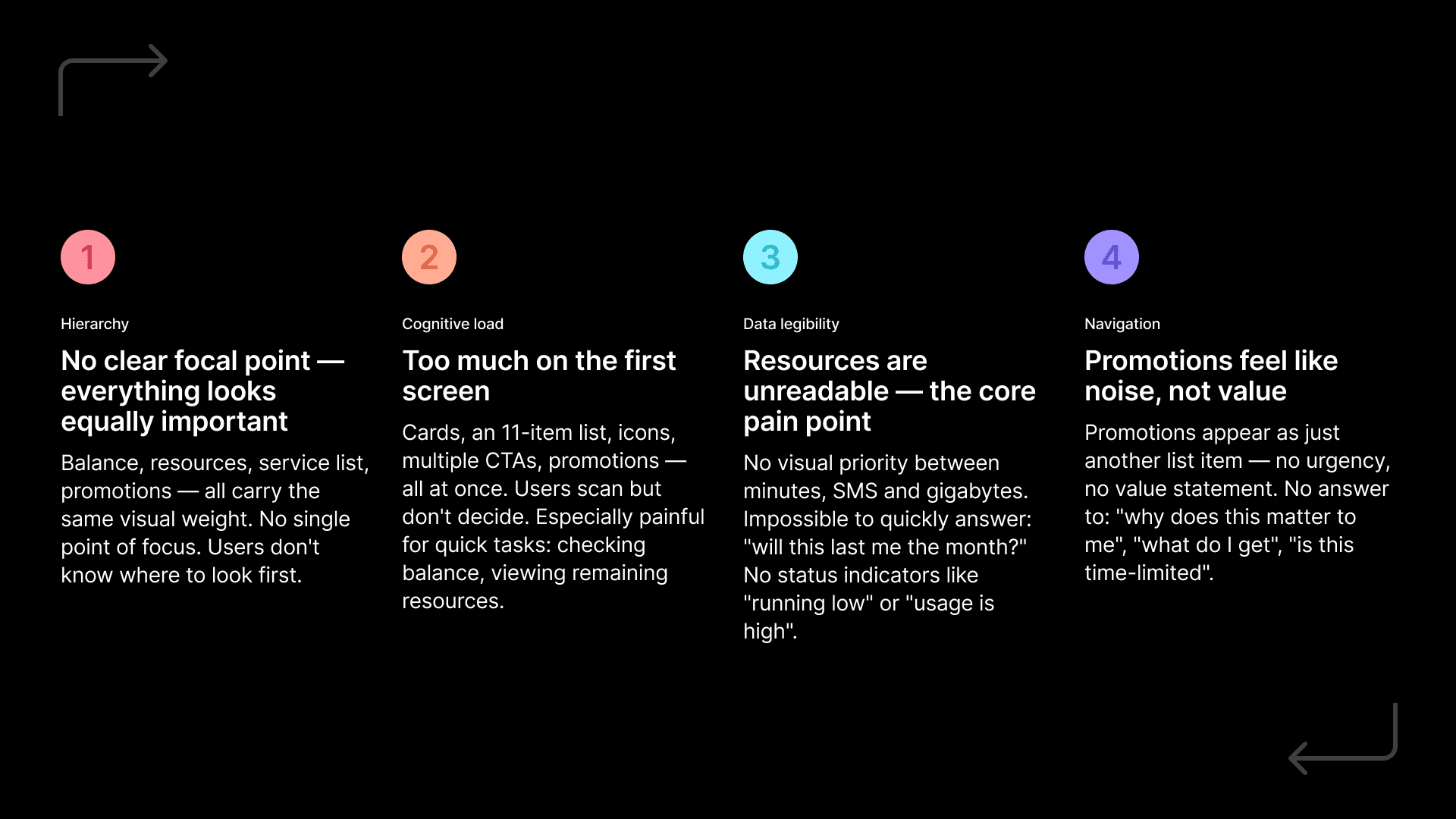 Metrics measured 30 days after the new home screen went live: −46% Time to first action +2.8× CTA click-through +31% Task completion rate Support contacts related to "can't find" dropped 22% in the first month.