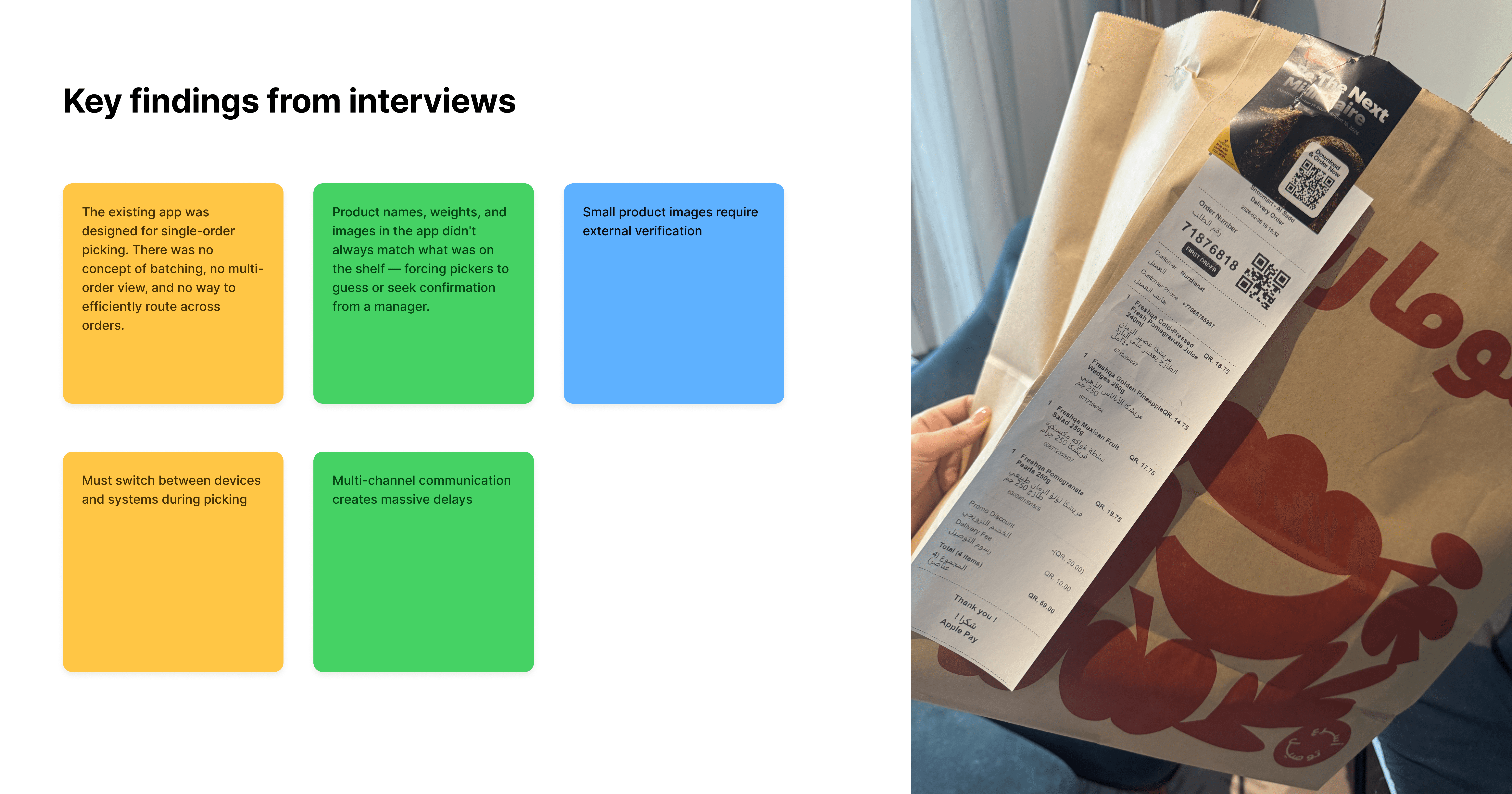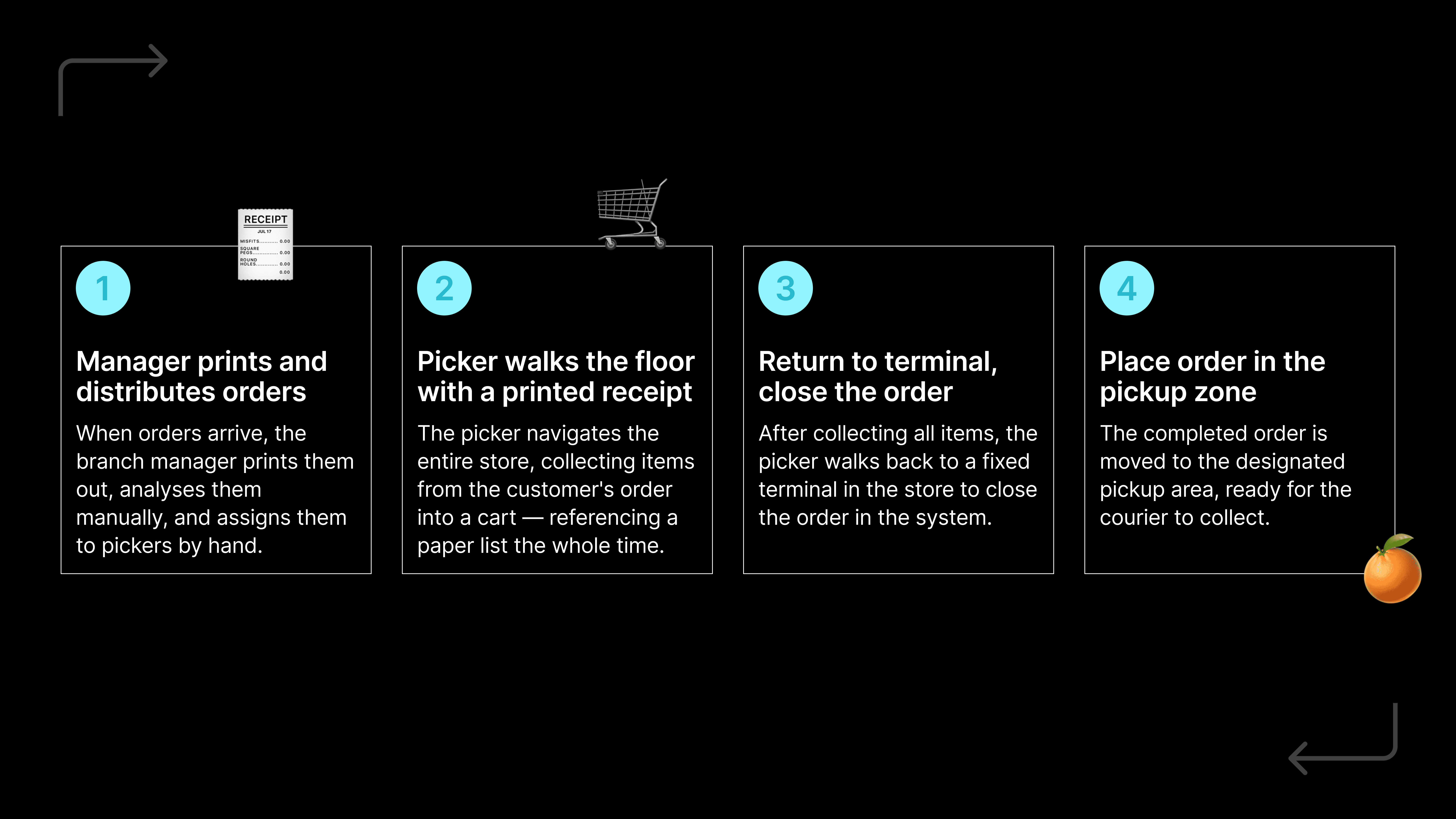 Pickers could only handle a single order at once. In large grocery buildings, this meant long walking paths, wasted time, and inefficiency during peak hours. Before the app, managers printed receipts, manually distributed them, and pickers walked the floor with paper lists.
