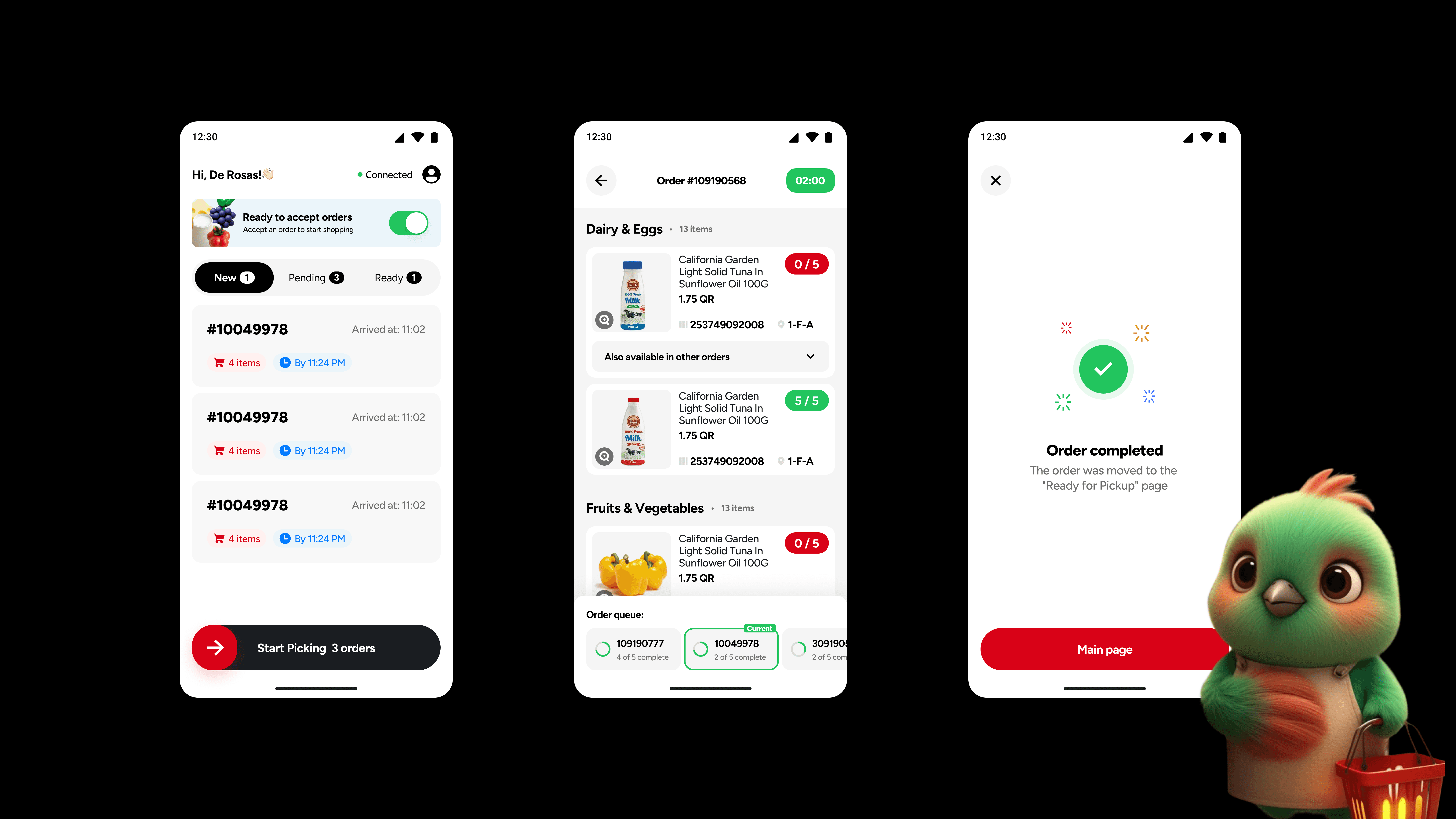 The redesigned Picker App enables concurrent order preparation — pickers see all their assigned orders, can navigate items across orders in a single trip, and handle issues without leaving the floor