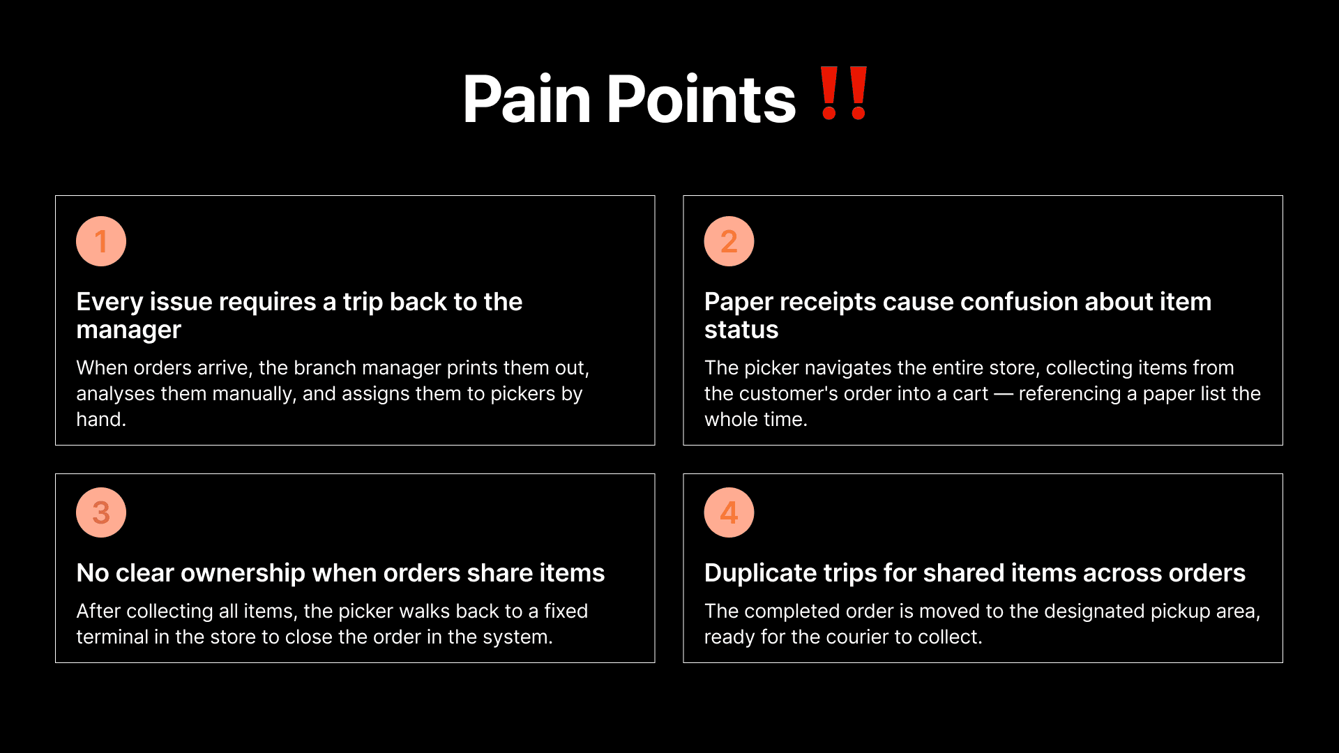 The single-order, paper-based flow created compounding inefficiencies across every picking session.